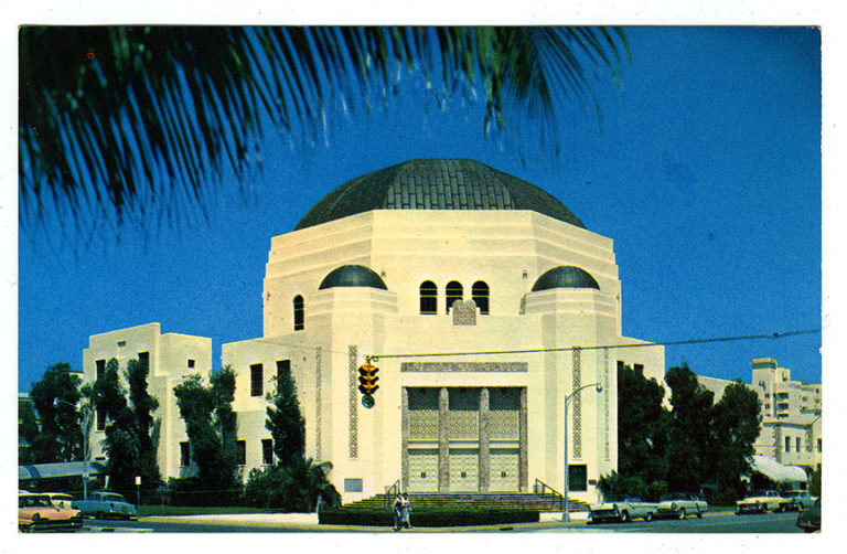 Temple Emanu-El’s style is also in keeping with the dominant Art Deco aesthetic of the area, and it is likely that architect Alfred Anis, who was well known for his many Art Deco hotels of the 1930s and 1940s, helped give the synagogue its final “Miami Beach” look. This was the last major synagogue Greco built. He competed for other post-war commissions but did not prevail.