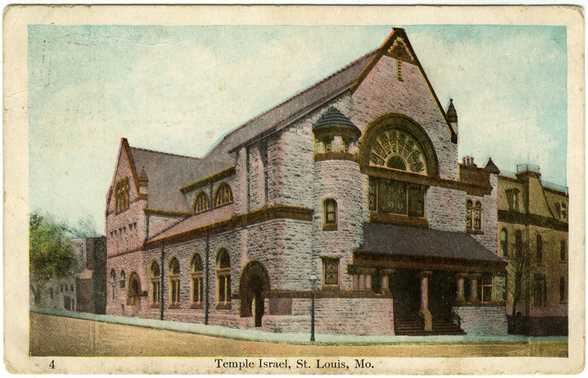 This postcard view shows the first home of Temple Israel in St. Louis, Missouri, built in 1888. Though the building was designed and constructed in the robust Richardsonian Romanesque style, as if it should last forever, the congregation stayed there only 20 years before moving westward in 1908 to a plot at Kingshighway Boulevard and Washington. Shortly before departing, the congregation had the tall tower removed because of structural problems. The building was sold to Union Memorial African Methodist Episcopal Church, which occupied the structure until it was acquired by eminent domain and demolished for “urban renewal” in 1959. The postcard must date to about 1908, then, after the removal of the tower and before the sale to the church.