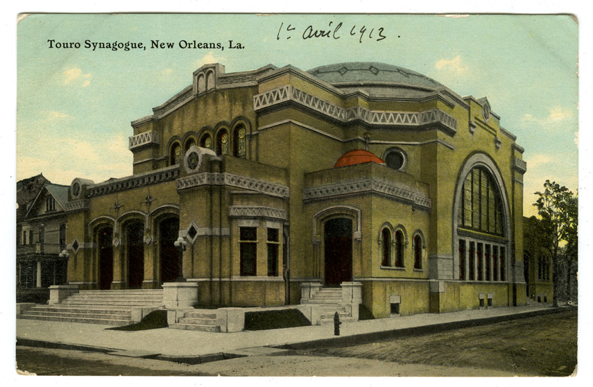 But there were a few variations and early experiments with forms that would become more common in the 1920s and afterward. In postcards, we see the notable and influential synagogue designs of Jewish architect Emile Weil for Touro Synagogue (1909) in New Orleans, Louisiana, which emulates domed synagogues popular in Central Europe; and Temple Mount Sinai (1916) in El Paso, Texas, a radical attempt to strip down a synagogue building to its geometric and structural fundamentals.